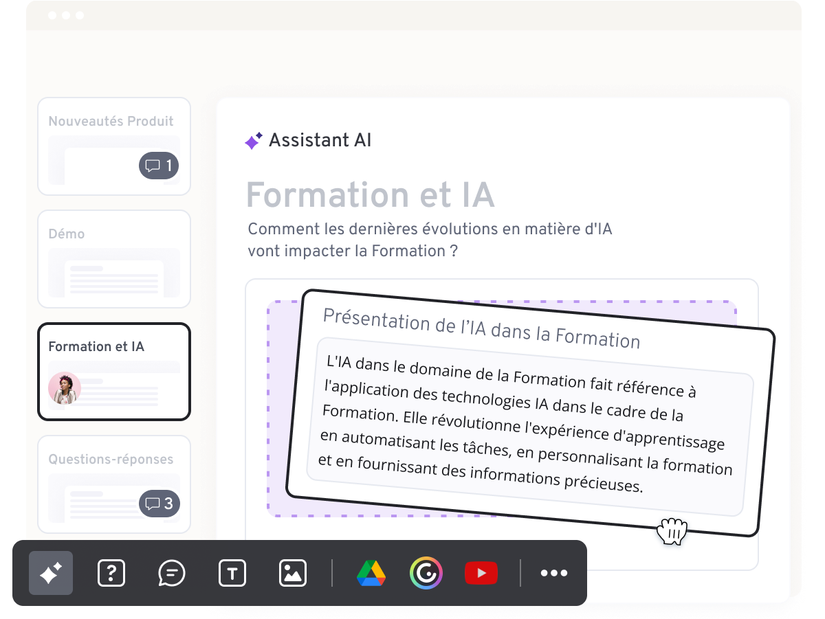 Laissez-vous guider par la création de cours assistée par l'IA pour ne plus partir d’une feuille blanche. Simplifiez la création de contenus de formation pour inciter au partage de connaissances et conserver vos savoir-faire.