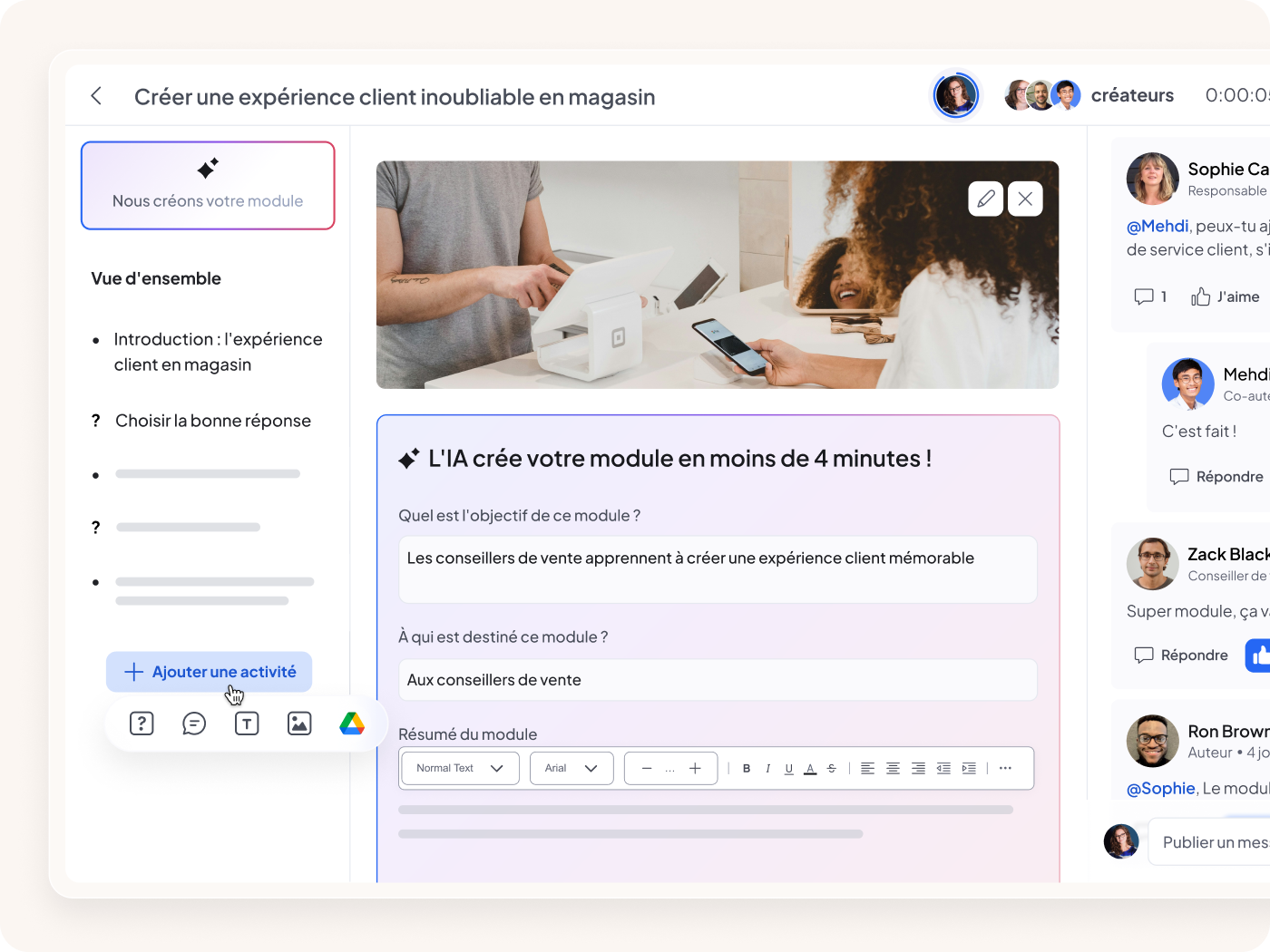 Permettez à vos collaborateurs experts au siège comme sur le terrain de partager leurs connaissances facilement grâce à un outil auteur facile à prendre en main. Laissez-vous guider par la création de modules de formation assistée par l’IA pour ne plus partir d’une feuille blanche.