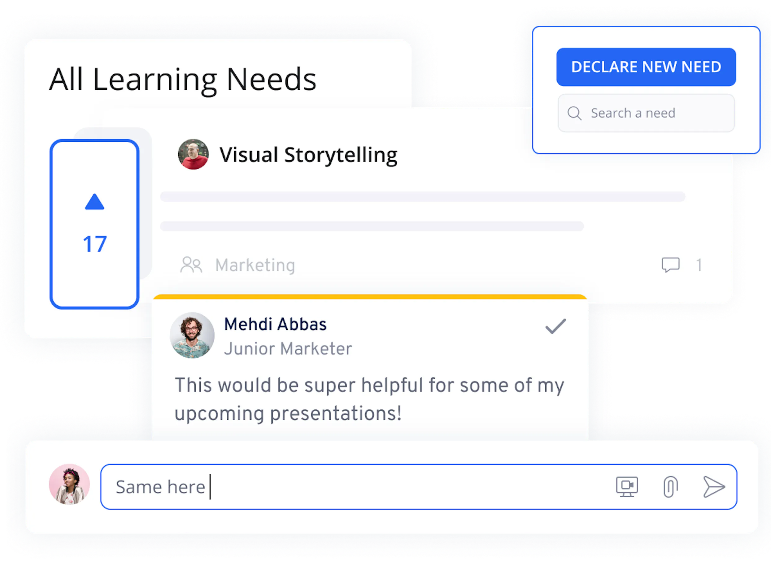 Ever find yourself guessing about what training your employees need? You don’t have to with 360Learning. With real-time declaration and upvoting of learning needs, learners can tell you exactly what training they need to succeed—all from within the LMS.