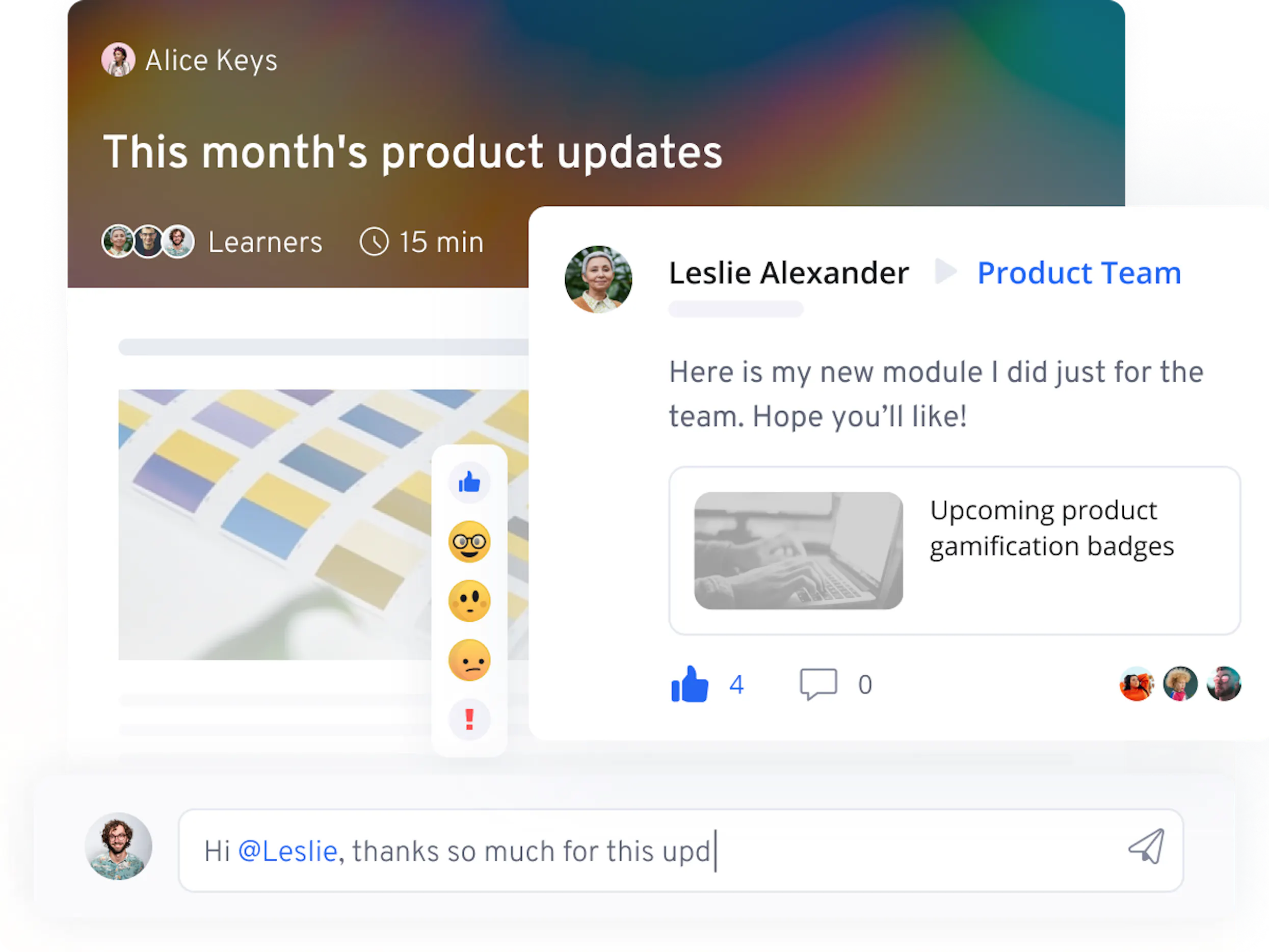 Keep courses fresh with real-time feedback from learners. See what they like and don't like with in-course commenting, threaded Q&As with upvoting, and learner relevance scoring, so you and your team can optimize course content and charge toward 91% completion rates.