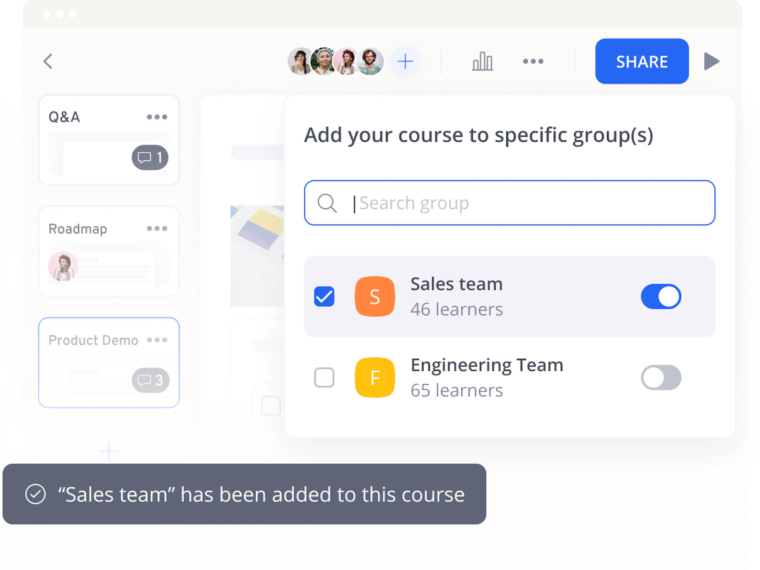 Transform your learning culture at your own pace. Our team is here for you every step of the way to lend support and help you with comprehensive training, including access to the 360Learning Knowledge Base.