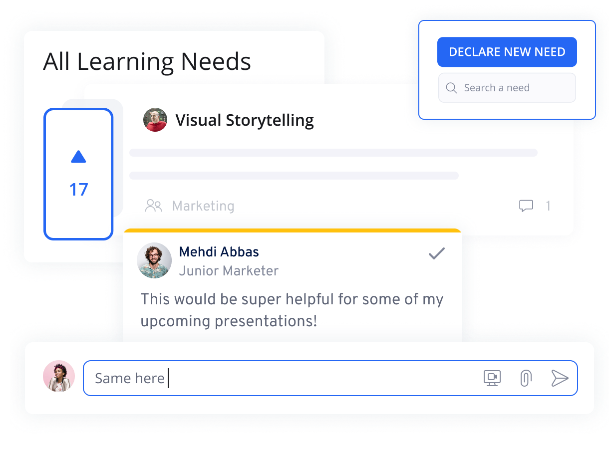 Ever find yourself guessing about what training your employees need? You don’t have to with 360Learning. With real-time declaration and upvoting of learning needs, learners can tell you exactly what training they need to succeed—all from within the LMS.
